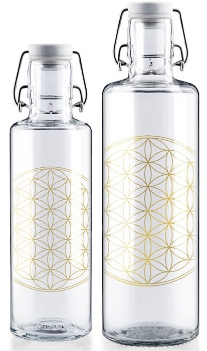 Deze fles is voorzien van de Flower of Life in goud. Deze Levensbloem kom je in verschillende oude culturen tegen als een krachtig symbool. De heilige geometrische ringen zouden een heilzame werking hebben. Klik hier voor meer informatie over deze Flower of Life (Engelse tekst).